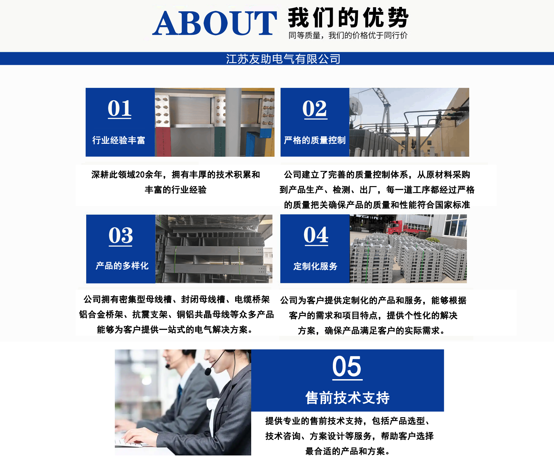 江蘇友助電氣有限公司地處中國工程電氣生產基地-一江蘇省揚中市。經營范圍:電纜橋架,母線槽(橋),管型母線,銅軟連接(伸縮節),高低壓開關柜,配電箱,抗震支架產品系列?!」咀谥迹嚎蛻糁辽稀R殉晒榻K二十屆省運會會場-泰州體育館,南京寶龍商業綜合體,張家口百兆瓦風電場,濟源市婦幼醫院,威海市未來科技園,湖北皇恩燁新材料科技有限公司,南京中央路小學,南通中天大酒店,新疆新安特鋼有限公司,河北省送變電有限公司,南京南微醫學研發基地等多項工程配套服務,我們愿與您精誠合作,互利共贏!公司技術人員深耕橋架,母線領域30年,為您提供橋架,母線槽疑難問題解決方案。母線槽不論每相是單排,雙排,三根排重疊,不管有多少個水平彎、垂直彎,轉接排在發貨前預裝一遍,確保尺寸無誤。到現場直接擰螺絲,效率高,橫平豎直,規規矩矩,符合標準,供電局,業主,監理,驗收易通過。供貨周期3-7天。為了讓尊貴客戶您,設備安全通電,高枕無憂。我們提供如下售前售中售后服務: 售前:免費技術支持,咨詢?!∈壑?免費現場精確測繪、設計?!∈酆?安裝服務,免費指導?!≠|量是生命,客戶是源泉。承諾客戶的,一定全力做到。讓我們一起進步!...